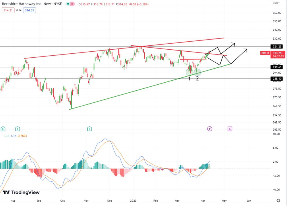 Die charttechnische Lage für Berkshire Hathaway ist gut. Kann nun die Oberseite des Dreiecks bei 313 Dollar überwunden werden, steht einer Aufwärtsbewegung bis 321 Dollar nichts mehr im Wege. Anleger bleiben dabei.