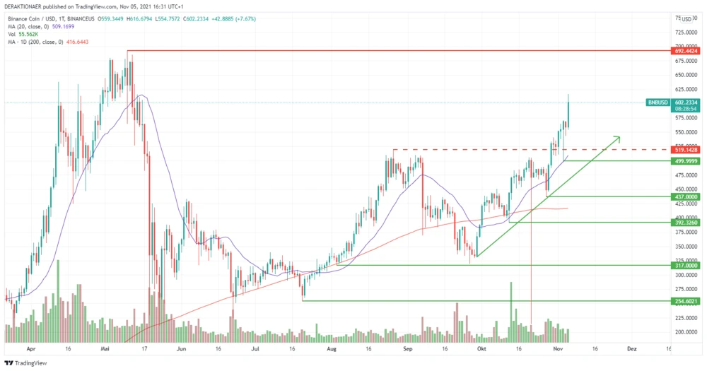 Am 19. Oktober berichtete DER AKTIONÄR über die spannende Lage bei dem Binance Coin. Zu diesem Zeitpunkt notierte der Kurs bei rund 480 Dollar und überzeuge mit einem positiven Momentum. Zugleich waren die Bullen drauf und dran, den massiven Widerstand bei der psychologisch wichtigen 500-Dollar-Marke zu knacken. Die Hürde wurde nur zehn Tage später gemeistert und ein entsprechend starkes Kaufsignal ausgelöst.
