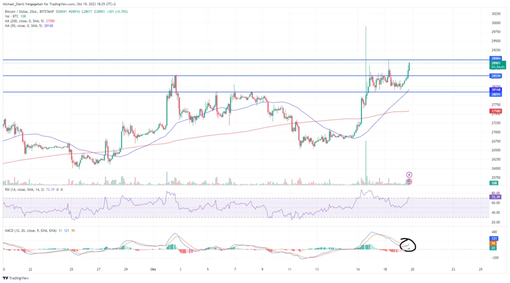 Schaffen es die Bullen, das Tageshoch von Mittwoch bei 28.984 Dollar zu überwinden, sollte der Weg in Richtung 30.000-Dollar-Marke frei sein und Bitcoin das Jahreshoch bei 31.818 Dollar anpeilen können.