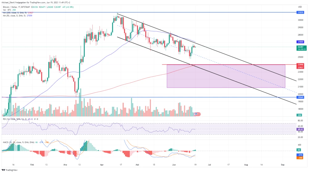 Seit dem Jahreshoch bei 31.035 Dollar verläuft der Bitcoin-Kurs in einer sogenannten Flaggenformation. Dabei testete er mehrfach sowohl die obere als auch die untere Begrenzung des Trendkanals. Zudem notiert Bitcoin derzeit zwischen der 50- und 200-Tage-Linie bei 27.059 respektive 23.927 Dollar.