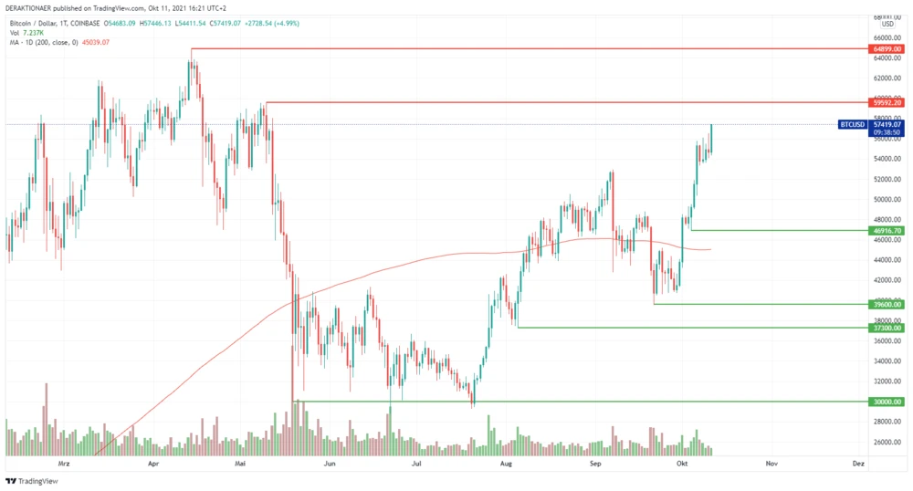 Am heutigen Montag drücken die Bullen aber bereits wieder aufs Gas und der Kurs legte um fünf Prozent zu. Als nächstes Etappenziel steht die runde 60.000-Dollar-Marke im Fokus der Anleger.