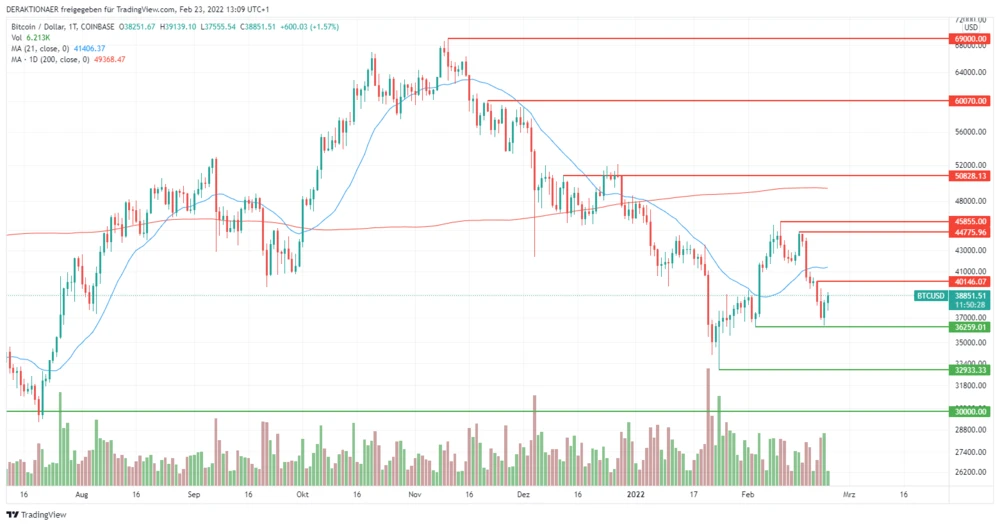 In der Folge fiel BTC am 22. Februar bei 35.350 Dollar auf ein frisches Tief. Hier liegt auch ein technischer Support. Heute setzt BTC die Erholung aus dem gestrigen Handel fort und kratzt nun an der 39.000 Dollar Marke. Wichtig ist jetzt, dass die Bullen möglichst zeitnahe die psychologisch wichtige 40.000-Dollar-Marke zurückerobern. Zugleich sollte das Tief nicht erneut unterschritten werden, wenn die Erholung nachhaltig sein soll.