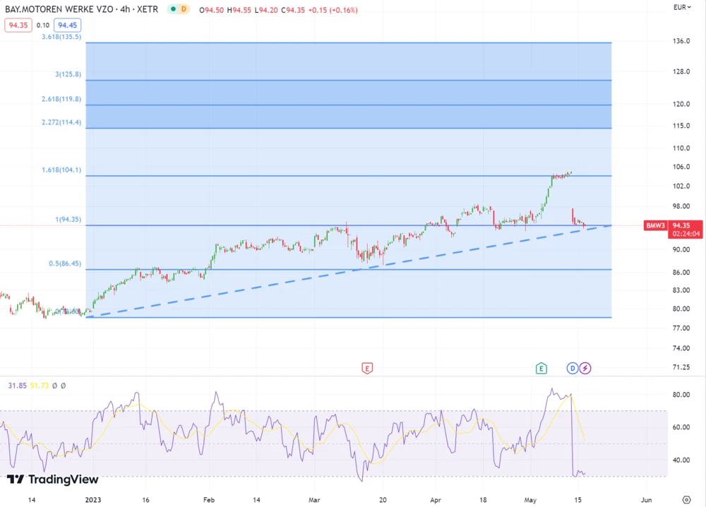 Für eine weitere Aufwärtsbewegung spricht nun das Kaufsignal im RSI-Indikator. Dieser ist von der überverkauften Zone wieder in die neutrale zurückgekehrt. Das nächste Ziel befindet sich an der 161,8%-Fibonacci-Erweiterungslinie bei 104,10 Euro. Lässt BMW auch diesen Widerstand hinter sich, ist der Weg zur 227,2%-Fibonacci-Linie bei 114,40 Euro frei.