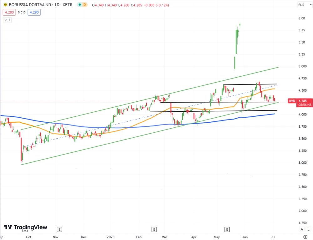 Das gestärkte Transfer-Budget könnte der Aktie einen positiven Schwung verleihen. Momentan notiert sie an der Unterseite eines seit September 2022 gültigen Aufwärtstrendkanals und zeitgleich an einer wichtigen Unterstützung bei 4,26 Euro. Gelingt es dem Kurs, diesen Support zu verteidigen, liegt der Fokus auf dem Mai-Hoch bei 4,61 Euro. Rückenwind verleiht dabei das Golden Cross vom Januar, welches immer noch aktiv ist.