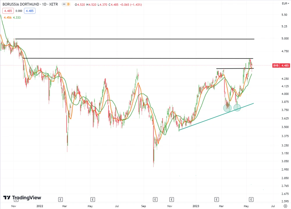 Gelingt der besagte Ausbruch, befindet sich das nächste Ziel am Mai-Hoch bei 4,61 Euro. Schafft es Borussia Dortmund auch hier über den Widerstand hinaus, steht die 5-Euro-Marke im Fokus, was einem Kurspotenzial von gut 13 Prozent entspricht.