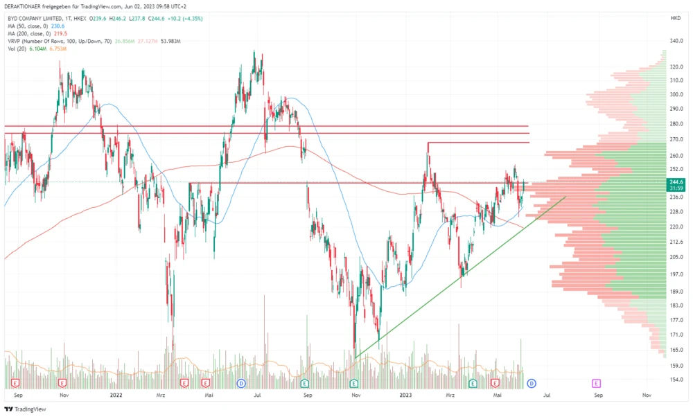 Der BYD-Aktie gelang daraufhin an der 50-Tage-Linie bei 227,60 HKD der Rebound. Mit dem heutigen Kurssprung steht die Aktie nun an einer wichtigen Schwelle. So notiert sie derzeit exakt an der Widerstandszone bei 245 HKD. An diesem Bereich endet zusätzlich ein breites Volumen-Cluster.