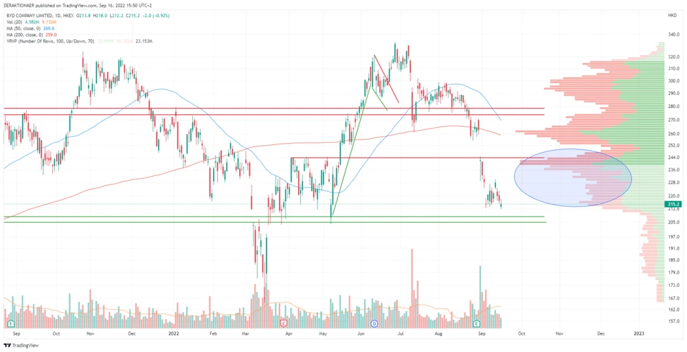 Ende August und Anfang September hat es die BYD-Aktie stark gebeutelt. infolge der Meldung von Warren Buffetts Verkäufen rutschte sie unter die Unterstützungszone um 275 Hongkong Dollar (HKD). Selbst die 200-Tage-Linie bei 264 HKD konnte auf dem Weg nach unten keinen Halt bieten.
