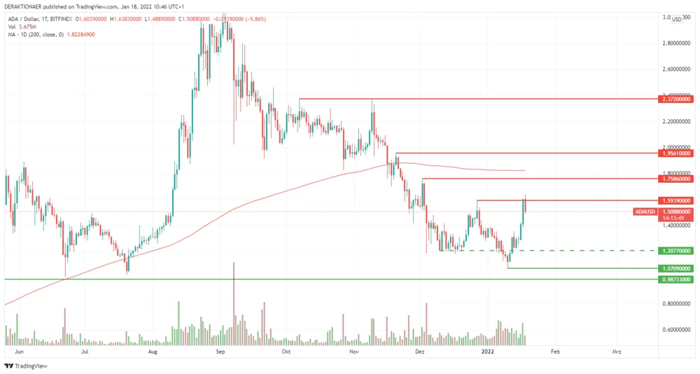 Das aktuelle Momentum bei Cardano ist stark bullish und mit dem steilen Kursanstieg der vergangenen Tage stellt ADA viele Coins in den Schatten. Als nächstes Etappenziel steht nach dem Widerstand bei 1,60 Dollar der GD200 bei 1,82 Dollar im Fokus der Bullen. Mit dem Sprung über den Widerstand wird ein neues Kaufsignal generiert, dass risikofreudige Anleger für den Einstieg nutzen können.