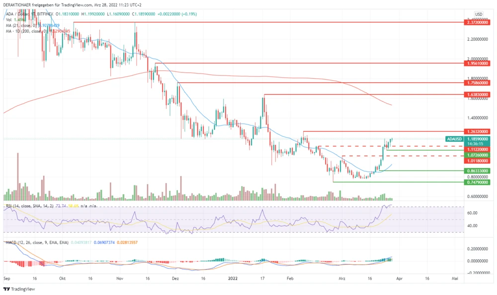Beflügelt durch diese Faktoren legte der ADA-Kurs in weniger als zwei Wochen um über 50 Prozent an Wert zu. Dabei wurde auch der kurzfristige Abwärtstrend durch ein technisches Gegensignal mit dem Ausbruch über den psychologisch wichtigen Widerstand bei der 1-Dollar-Marke ausgelöst. Inzwischen haben die Bullen auch den nächsten Widerstand bei 1,10 Dollar geknackt und nehmen nun das nächste Etappenziel bei 1,26 Dollar ins Visier.