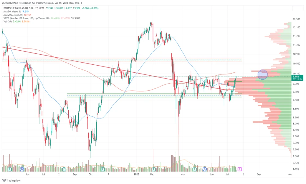Die Deutsche-Bank-Aktie zieht weiter kräftig an. Aus Sicht des AKTIONÄR – mit Blick auf die niedrige Bewertung (2024er-KGV von 4,5) – bleibt der Titel aussichtsreich. Aus charttechnischer Sicht wäre es jetzt wichtig, dass der Finanztitel die 10-Euro-Marke nachhaltig überwindet. Das würde frisches Aufwärtspotenzial generieren. Kurzum: Investierte bleiben dabei, etwaige Neueinsteiger, die auf Nummer sicher gehen wollen, warten den Ausbruch beziehungsweise die Quartalszahlen am 26. Juli ab.
