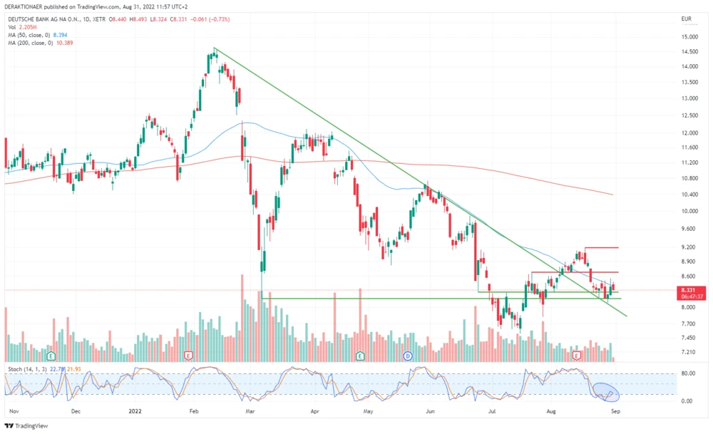Anfang August konnte die Aktie der Deutschen Bank die mittelfristige Abwärtstrendlinie knacken und ließ dabei die Anleger jubeln. Die Freude ebbte jedoch schnell ab. Angekündigt durch niedriges Handelsvolumen entpuppte sich der Ausbruch als Fehlsignal. Prompte setzte der Titel zurück und fiel dabei unter den Support an der 50-Tage-Linie bei 8,58 Euro.