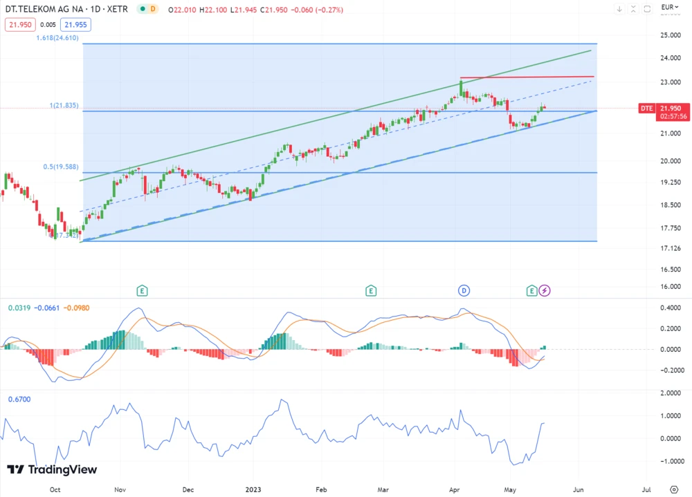 Das nächste Ziel befindet sich am April-Hoch bei 23,12 Euro. Gelingt auch hier der Ausbruch, ist der Weg zur 161,8%-Fibonacci-Erweiterungslinie bei 24,61 Euro frei.