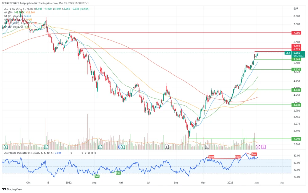 Aus technischer Sicht steigt kurzfristig die Wahrscheinlichkeit für eine Verschnaufpause der Bullen. Gleichzeitig sollten sich investierte Anleger hiervon nicht verunsichern lassen, da der Trend stark ausgeprägt ist und die mittelfristige Chance für weitere Kurssteigerungen gegeben ist. Neueinsteiger warten auf das Kaufsignal, sobald die Deutz-Aktie den nachhaltigen Ausbruch über die 6-Euro-Marke gemeistert hat.