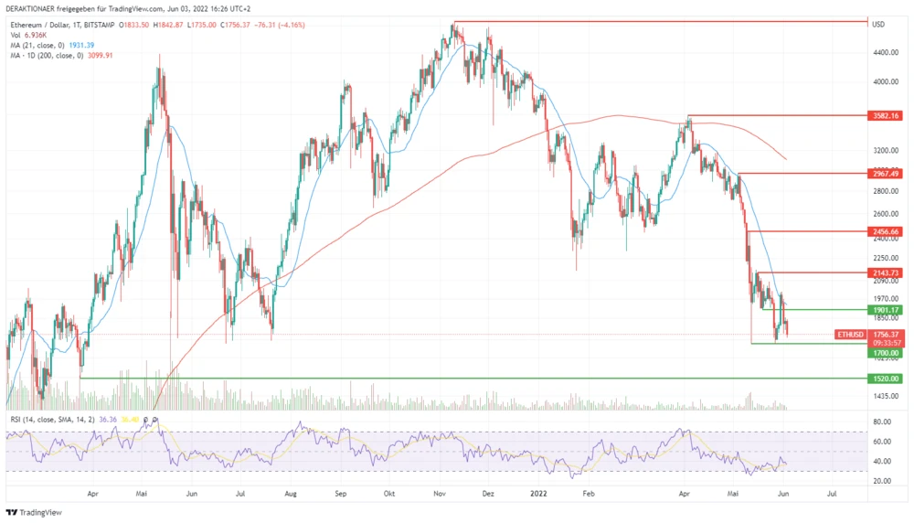 Dabei ist der Coin wieder nahe an einer wichtigen Unterstützung bei 1.700 Dollar zurückgefallen. Bis hierhin fiel der Preis bereits zwei Mal im Mai und die technische Konstellation spricht eher gegen einen erneuten Abpraller, da das negative Trendmomentum weiter anzieht.