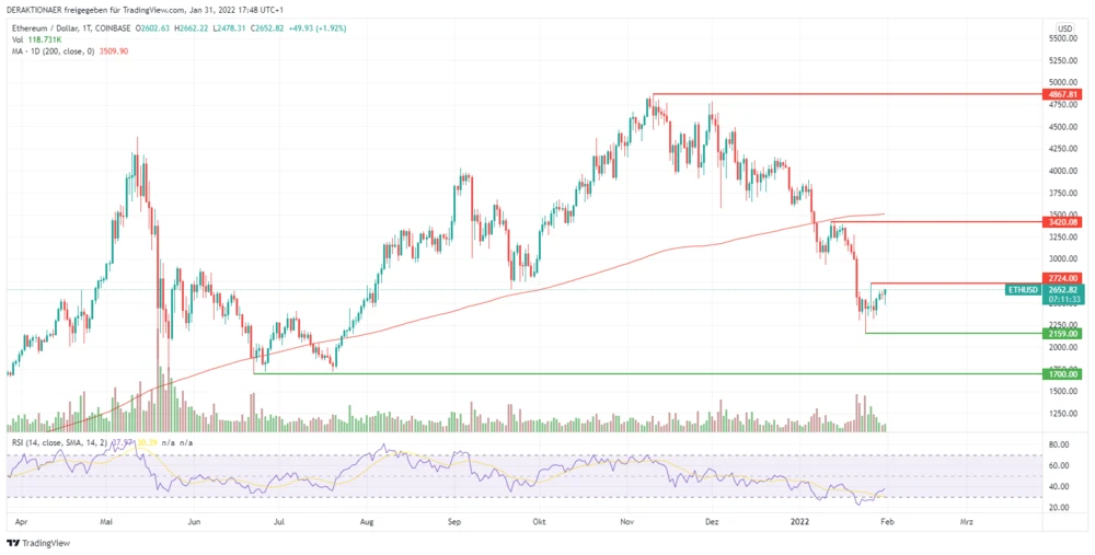 Nach dem Allzeithoch bei 4.867 Dollar und der anschließenden Kurshalbierung ist die Zeit reif für einen Rebound. Zumindest aus charttechnischer Sicht ist eine Erholung überfällig. Zuletzt ist Ether (ETH) auf ein neues Mehrmonatstief bei 2.159 Dollar gefallen. Im Anschluss waren erste Schnäppchenjäger zurück und der Kurs konnte sich rasch bis auf 2.724 Dollar erholen.