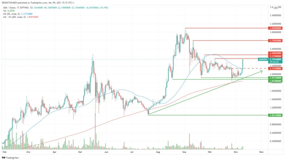 Im Anschluss rückt der Widerstand bei 2,80 Dollar in den Fokus. Der GD200 bei 1,84 sowie die psychologisch wichtige 2-Dollar-Marke stützen die Rally. Zusätzlich ist der Gründer vom Cardano-Projekt, Charles Hoskinson, aktuell auf einer mehrwöchigen Afrika-Reise für neue Kooperationen mit Regierungen und Start-Ups. Beispielsweise können schon jetzt Millionen Schulkinder in Äthiopien ihre schulische Laufbahn mittels „Atala PRISM“ dokumentieren, nachweisen und verwalten. Weitere solcher Projekte und Partnerschaften sollen folgen – die Fantasie der Anleger wird also weiter beflügelt.