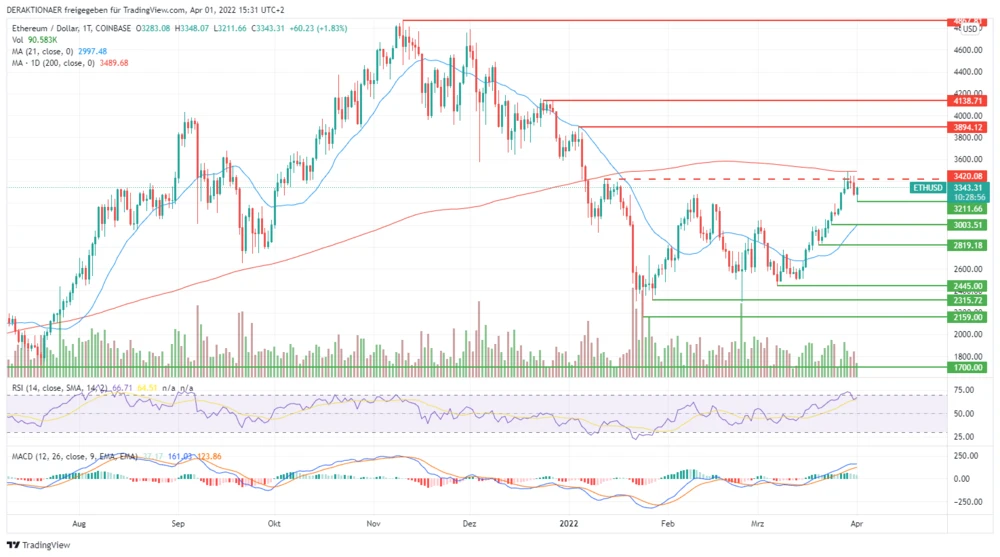 Vor wenigen Tagen verwies DER AKTIONÄR bereits auf die aktuelle Lage bei ETH und dass sich Gewinnmitnahmen am GD200 anbahnen. Der Rücksetzer verlief wie vermutet bis zur wichtigen 3.200-Dollar-Marke.