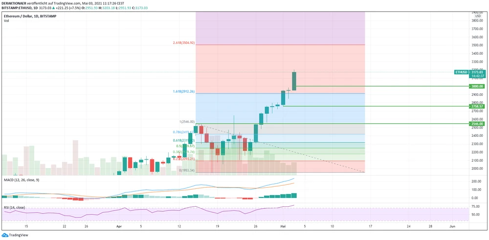 Deren Entwicklung seit Jahresbeginn ist beeindruckend. Während der Bitcoin seinen Preis „nur“ verdoppelt hat, konnte ETH um mehr als 330 Prozent zulegen. Zum Monatswechsel in den Mai knackte der Kurs nun die wichtige psychologische Marke von 3.000 Dollar. An solch wichtigen Marken kommt es oft zu kurzfristigen Gewinnmitnahmen. Der Trend ist allerdings so stark, dass Ether am heutigen Montag einfach weiter anzieht und ein neues Rekordhoch bei 3.200 Dollar aufstellte.