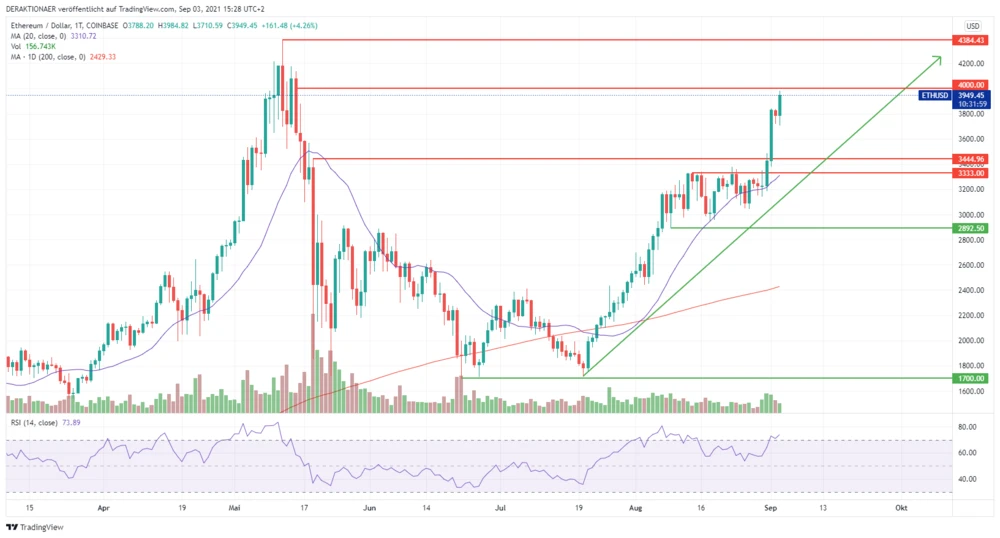 Die Anleger feiern das Comeback der Krypto-Währungen und so beschleunigte sich die aktuelle Rallye besonders bei Ethereum noch einmal. Durch das Kursfeuerwerk konnte der Kurs sich am heutigen Freitag sogar fast bis an die wichtige psychologische 4.000-Dollar-Marke vorkämpfen. Damit verteuerte sich der Preis für einen Ether innerhalb der letzten fünf Handelstage um über 22 Prozent.