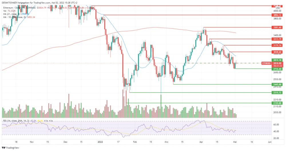 Im Wochenendhandel fiel ETH bis auf rund 2.700 Dollar und erholte sich am Sonntag vom Vortagesverlust. Aktuell pendelt der Kurs wieder um die 2.800-Dollar-Marke. Bis Mittwoch werden sich die Marktteilnehmer wahrscheinlich zurückhalten, private Anleger sollten sich ebenfalls mit Zukäufen gedulden und die Marktreaktion am Mittwoch abwarten.