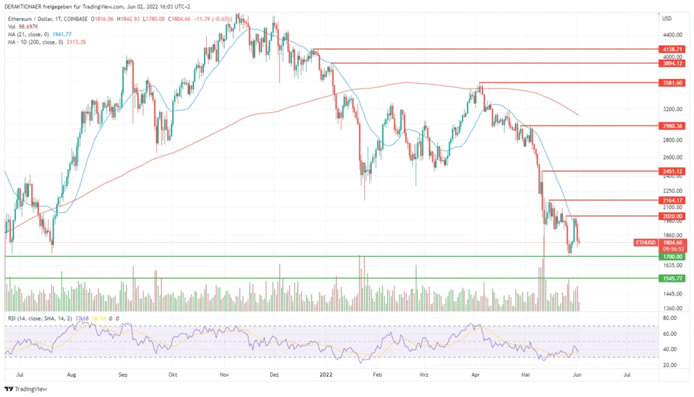 Bei ETH rückt damit wieder das Jahrestief bei 1.700 Dollar in den Fokus. Die Marke fungiert gleichzeitig als starker Support, auf dem nun die Hoffnungen der Anleger beruhen. Sollte diese Marke nicht ein drittes Mal halten, droht ein Absturz bis auf das 52-Wochen-Tief bei rund 1.550 Dollar.