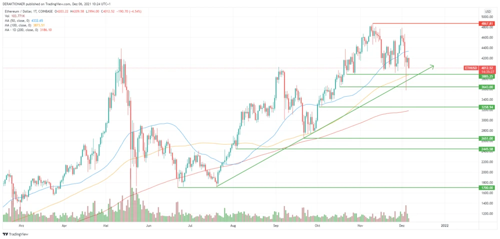 Das Wochenende war von kräftigen Turbulenzen am Kryptomarkt geprägt. Bei Ethereum ging es wie bei vielen anderen Coins zwischen Freitag und Samstag zweistellig nach unten. Ether hat sich dabei relativ schnell wieder erholt und konnte zumindest die psychologisch wichtigen 4.000-Dollar-Marke zurückerobern. Diese Marken sind jetzt für die Anleger wichtig.
