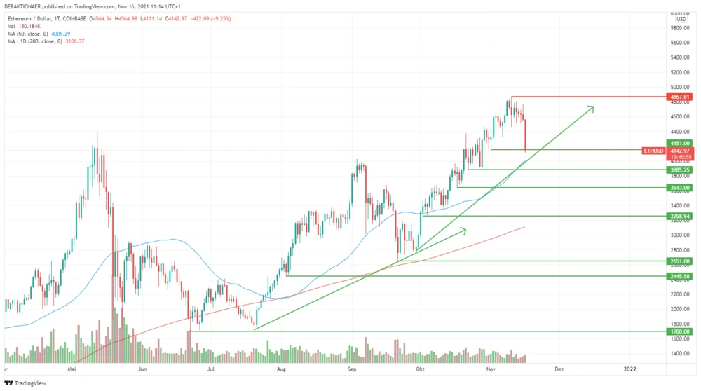 DER AKTIONÄR warnte bereits vor einigen Tagen vor einer drohenden Korrektur bei Ether (ETH), da die Rally zu einer Überhitzung geführt hatte. Nun entweicht der Druck aus dem Kessel und die Bullen machen Kasse. Seit dem Allzeithoch bei 4.868 Dollar hat der Titel bisher rund 14 Prozent an Wert verloren, das ist allerdings nichts Ungewöhnliches für eine Kryptowährung.