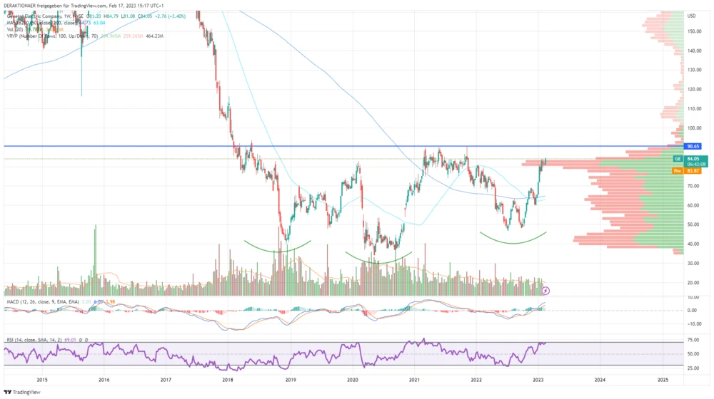 Seit mehr als drei Jahren notiert die Aktie von General Electric nun schon unter der Marke von 90 Dollar. Lediglich eine Ausnahme gab es im November 2021, als der Kurs kurz darüber sprang. Nun nähert sich GE wieder dieser magischen Marke. Die Chancen stehen gut, dass der Sprung darüber diesmal gelingt.