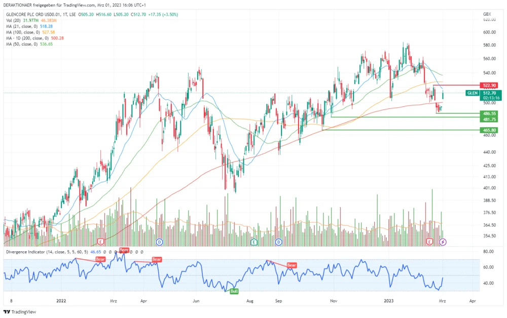 Nachdem der Jahresstart bei der Glencore-Aktie schwach ausfiel, zieht der Titel jetzt wieder an. Mit dem heutigen Sprung über die 200-Tage-Linie bei der psychologisch wichtigen 500-Pence-Marke wurde ein frisches Kaufsignal ausgelöst. Zugleich wurde die massive Unterstützungszone in diesem Bereich bestätigt. Das Wertpapier befindet sich auch auf der Empfehlungsliste mit einem Kursziel von 10,00 Euro und einem Stopp bei 5,00 Euro.