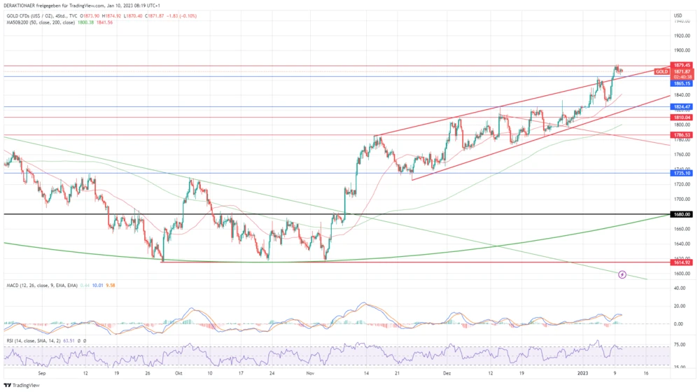 Über 250 Dollar hat Gold in der Rally seit Anfang November hinzugewonnen. Das Edelmetall überwand am Montag sogar kurzzeitig das Juni-Hoch bei 1.879,45 Dollar, aber konnte den Tag nicht darüber abschließen. Der Widerstand gilt aus technischer Sicht deshalb noch nicht als gebrochen.