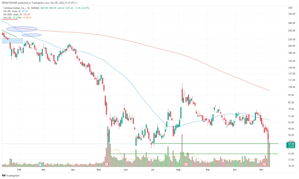 Betroffen ist auch die Krypto-Handelsplattform Coinbase. Die Aktie rauscht bereits seit Ende Oktober immer weiter ab. Zu Wochenbeginn fiel sie zuletzt nachhaltig unter die horizontale Unterstützung bei 60 Dollar und generierte damit ein Verkaufssignal. Nach einem rund achtprozentigen Minus am heutigen Mittwoch notiert der Titel nun an der Unterstützungszone, die sich zwischen 40,83 und 45,95 Dollar aufspannt. Kurs darunter würden den Abverkauf beschleunigen.