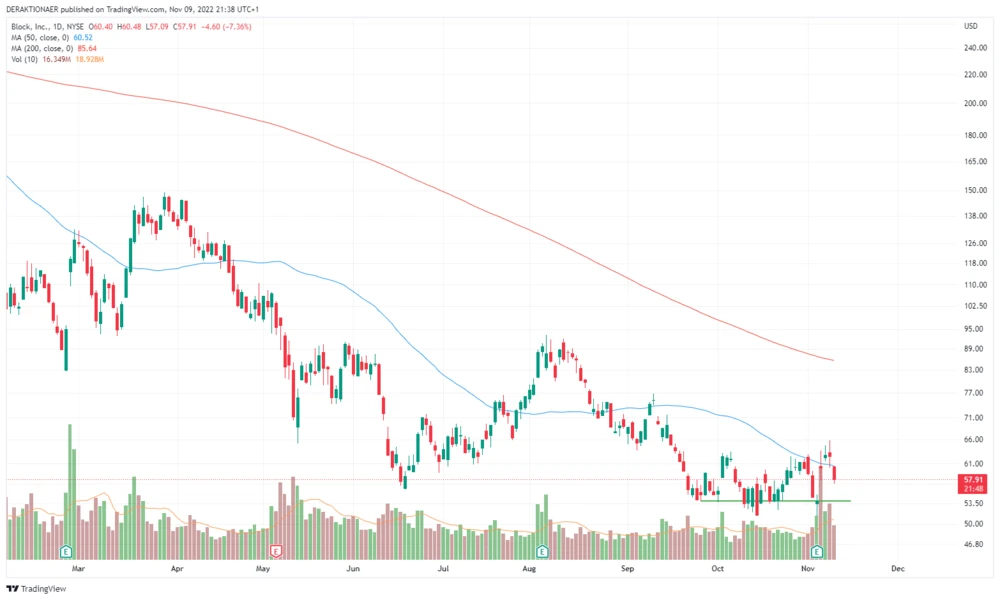 Das Finanzdienstleistungs- und Mobile-Payment-Unternehmen Block, welches ebenfalls Umsatz mit dem Bitcoin-Handel erwirtschaftet, steht unter den eben vorgestellten Aktien noch am besten da. Mit einem Tagesverlust von aktuell minus sieben Prozent hat es das Unternehmen zwar auch deutlich erwischt. Dennoch hat die Aktie – bis auf den Bruch des GD50 – keine bedeutenden Verkaufssignale ausgelöst. Solange sich der Titel über der Horizontalen bei 52 Dollar halten kann, ist die Bodenbildung noch im Gange.