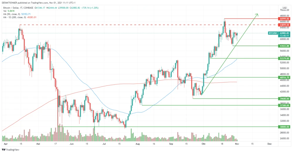 Bitoin erreicht am 20. Oktober laut Coinbase ein neues Allzeithoch bei 66.999 Dollar. Auch hier setzten im Anschluss Gewinnmitnahmen ein. Der Kurs sackte in der vergangenen Woche bis auf 57.653 Dollar ab. Seit einigen Tagen übernehmen die Bullen das Ruder und der Preis notiert wieder über der wichtigen 60.000-Dollar-Marke. Damit setzt sich die Rallye auch beim Bitcoin fort.