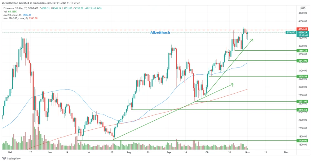 Bei Ethereum war es in den späten Abendstunden am vergangenen Freitag nun auch so weit. Wie DER AKTIONÄR bereits vermutete, knackte rund eine Woche nach Bitcoin nun auch Ethereum (ETH) das Allzeithoch. Die neue Rekordmarke bei ETH ist laut Notierung bei Coinbase bei 4.462 Dollar. Am Wochenende setzten dann leichte Gewinnmitnahmen ein. Am heutigen Montag drücken die Bullen aber bereits wieder aufs Gas. Der Trend ist intakt, das Sentiment bullish und der Kurszuwachs bei ETH ist noch nicht überhitzt. Also gute Rahmenbedingungen für weiter steigende Kurse.