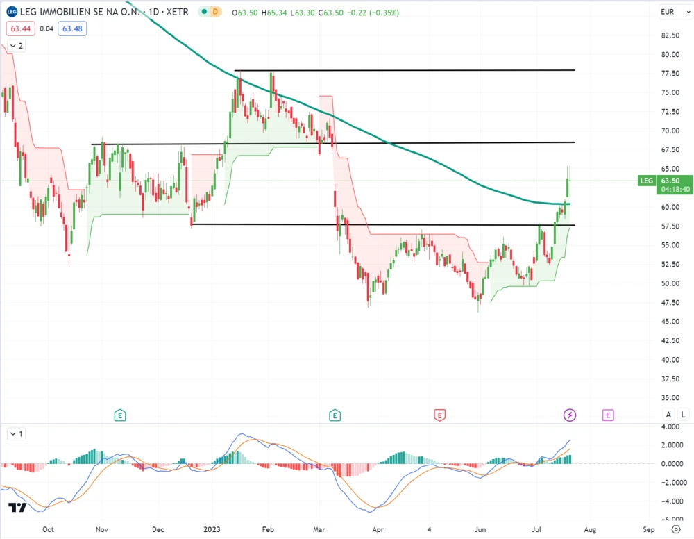 Mit dem heutigen Kursanstieg bestätigt LEG Immobilien den nachhaltigen Sprung über die 200-Tage-Linie, die aktuell bei 60,34 Euro verläuft. Zusätzlichen Rückenwind erhält die Aktie von MACD-und Supertrend-Indikator, die beide ein Kaufsignal generiert haben.