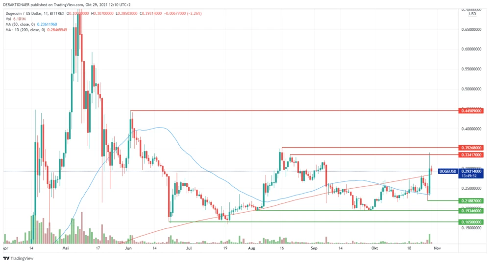 Dogecoin ist einer der ersten Meme-Coins gewesen und hat schon einige massive Kursschwankungen durchgemacht. Die Performance im Oktober ist zwar mit 50 Prozent nicht so beeindruckend wie die vom Sohnemann, aber dennoch beachtlich. Besonders sticht der gestrige Donnerstag heraus, der Kurs explodierte bis zu 43 Prozent und schloss mit einem Plus von 26 Prozent. Der größte Tagesgewinn seit Wochen.