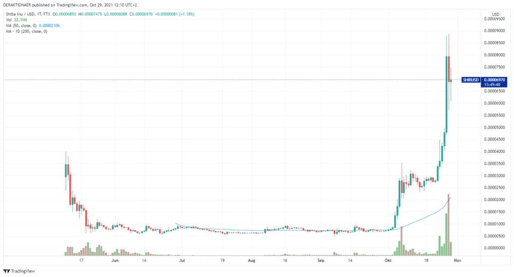 Shiba Inu stellt beide Coins problemlos in den Schatten. Die Performance im Oktober beträgt aktuell über 900 Prozent. Zwischenzeitlich hatte Shiba Inu sogar den Dogecoin bei der Marktkapitalisierung überholt. Momentan sind sie beide gleichauf und das Volumen beläuft sich auf rund 39 Milliarden. Da es sich hierbei um keine nachhaltige Kursbewegung handelt, liegt auf der Hand. Für manche Anleger sind solche Kursbewegungen allerdings zu verlockend und daher wird das wilde Treiben wohl vorerst weiter gehen.