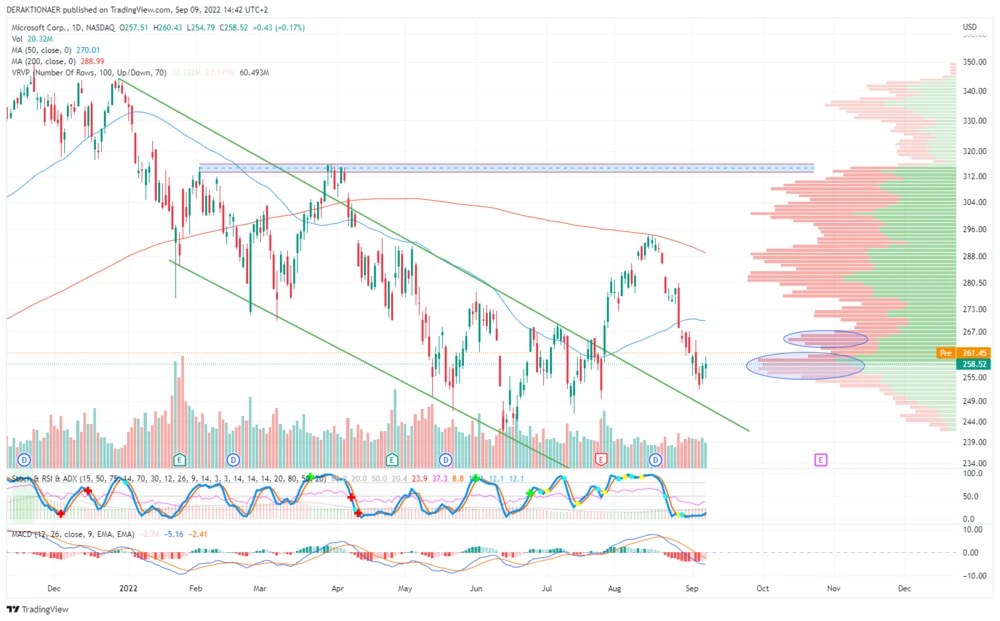 Die Freude, nachdem die Microsoft-Aktie Ende Juli über ihre mittelfristige Abwärtskanal bei 262 Dollar und damit ein Kaufsignal generierte, verpuffte recht schnell. Mitte August prallte sie nahezu punktgenau am Widerstand an der 200-Tage-Linie bei 294 Dollar ab. Sämtliche Kursgewinne wurden in den darauffolgenden drei Wochen wieder verzockt.