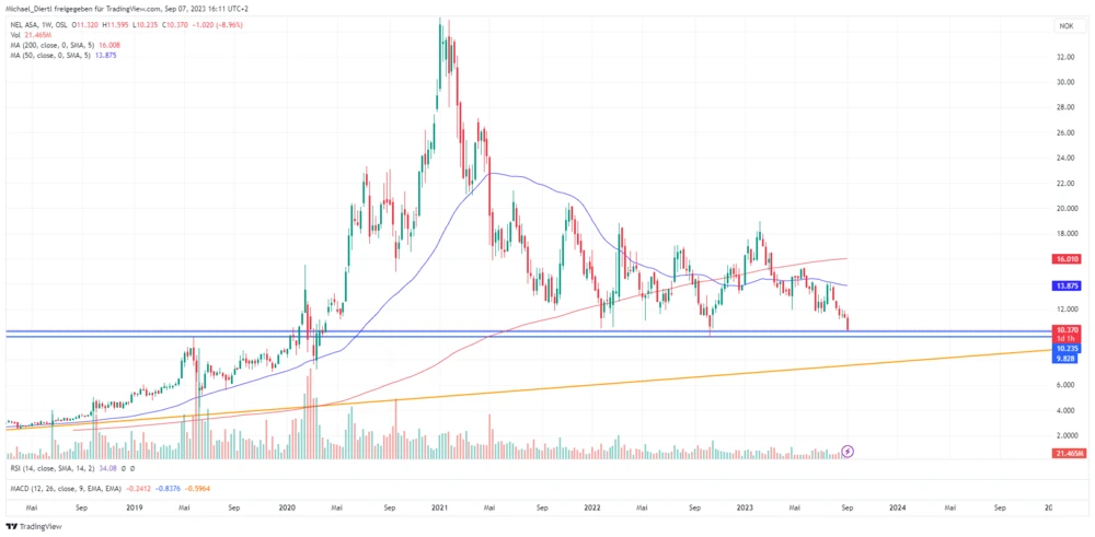 Rund ein Viertel ihres Börsenwerts hat die Nel-Aktie seit Jahresbeginn eingebüßt. Am Donnerstag markierte sie sogar ein neues Jahrestief bei 10,23 Kronen und erzeugte damit ein Verkaufssignal. Der Blick dürfte also zunächst weiter nach unten gehen.