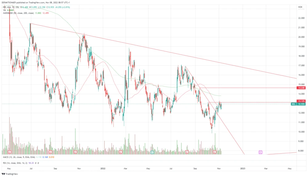 Nachdem die Nel-Aktie das Oktober-Hoch bei 13,12 NOK kurz überwunden hat, konsolidiert sie seit dem 1. November leicht darunter. Eine solche Seitwärtsphase ist aus charttechnischer Sicht als Krafttanken des Kurses für die nächste impulsive Bewegung zu interpretieren.