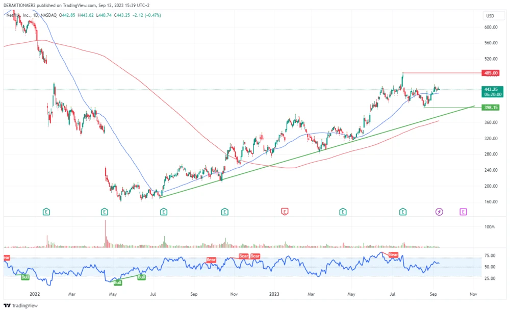 Die Netflix-Aktie hat 2023 einen starken Lauf. Seit Jahresbeginn hat der Titel um rund 45 Prozent zulegen können. Zwischenzeitig lag die Performance sogar bei 65 Prozent. Nach dem Jahreshoch bei der 485-Dollar-Marke Mitte Juli machten Anleger Kasse und der Titel vollzog eine Konsolidierung.