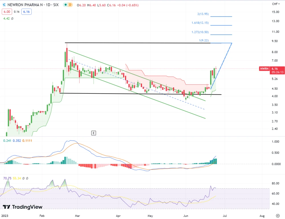 Das nächste Ziel liegt nun am Allzeithoch vom Februar bei 9,20 Schweizer Franken. Bei anhaltender Dynamik könnte Newron Pharmaceuticals sogar ein neues Rekordhoch an der 127%-Fibonacci-Erweiterungslinie bei 10,50 Franken erreichen. Rückenwind gibt es dabei von Kaufsignalen im Supertrend- und dem MACD-Indikator.