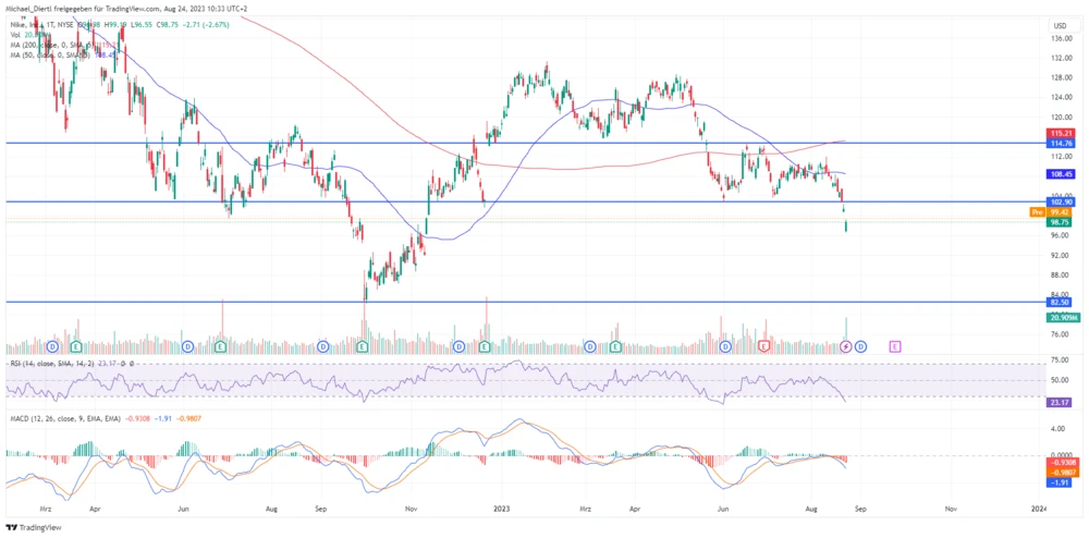 Eine Trendwende wäre allerdings erst dann möglich, wenn der Chart sich aus der technisch schwachen Lage befreit und wieder Kaufsignale erzeugt. Ein Kursanstieg über den GD50 bei 108,45 Euro wäre ein erster Hinweis darauf. Jedoch kann man erst von einem Befreiungsschlag sprechen, wenn Nike über das Juni-Hoch bei 114,76 Dollar sowie den GD200 bei 115,21 Dollar klettert.
