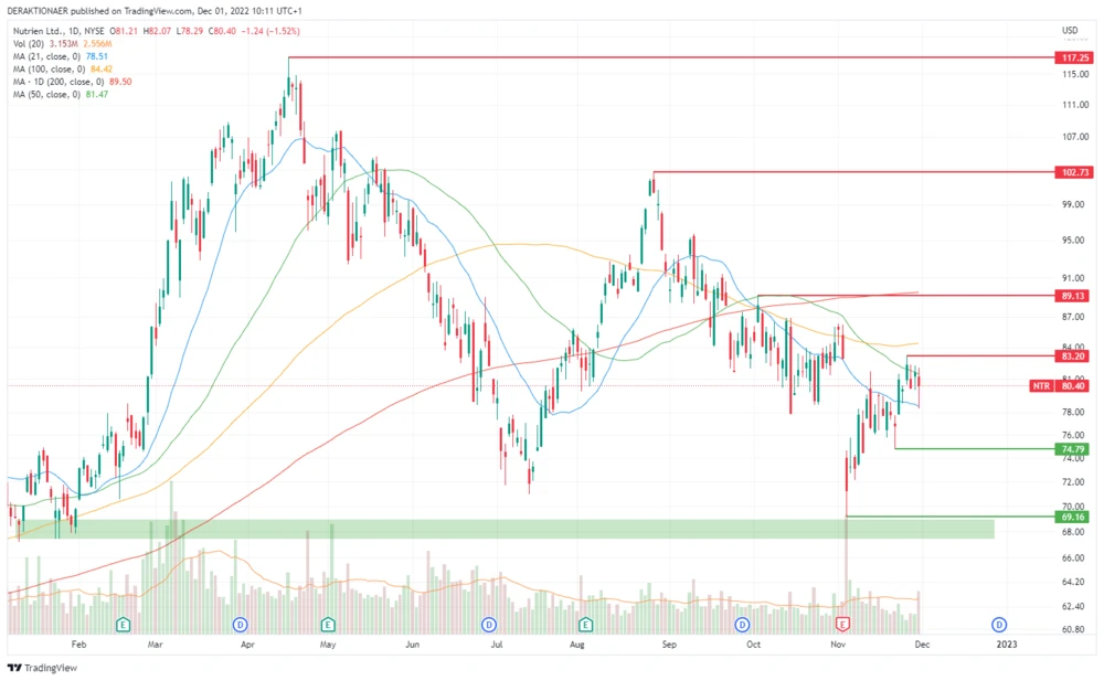 Die Aktie des Düngemittel-Konzerns befindet sich übergeordnet noch auf Richtungssuche. Anfang November schmeckten den Anlegern das neuste Zahlenwerk nicht und der Titel fiel auf ein frisches Jahrestief bei 69,16 US-Dollar. Im Anschluss übernahmen dann die Bullen wieder das Ruder und die Aktie legte im Monatsverlauf um bis zu 20 Prozent zu. Kurzzeitig knackte der Titel auch den GD50 bei 81,82 Dollar. Im Anschluss sackte der Kurs bedingt durch Gewinnmitnahmen wieder ab.