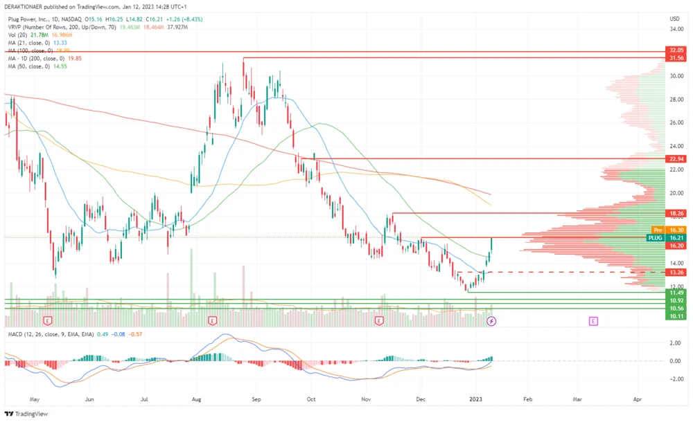 In den vergangenen Tagen hat das Kaufinteresse bei der Plug-Power-Aktie dafür gesorgt, dass sich der Titel immer weiter vom Mehrjahrestief bei 11,49 Dollar entfernt hat. Auch die beiden gleitenden Durchschnitte (GD21 bei 13,33 Dollar und GD50 bei 14,55 Dollar) haben die Bullen mühelos geknackt und damit technische Kaufsignale ausgelöst. Zugleich fungieren die beiden Marken nun als Unterstützungen.