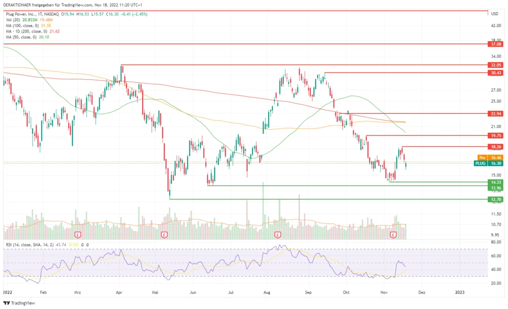 In der vergangenen Woche ging es zunächst weiter Abwärts und die Plug-Power-Aktie erreichte ein neues Mehrmonatstief bei 14,33 Dollar. Damit hat der Titel in nur zwei Monaten rund 50 Prozent verloren. Nach so einem starken Kursrückgang notierte der RSI-Indikator auch mehrere Tage im Überverkauft-Bereich. Zudem spannt sich im Bereich der 14-Dollar-Marke eine massive Unterstützungszone auf. Grund genug für einige Bullen einen antizyklische Positionen einzugehen.