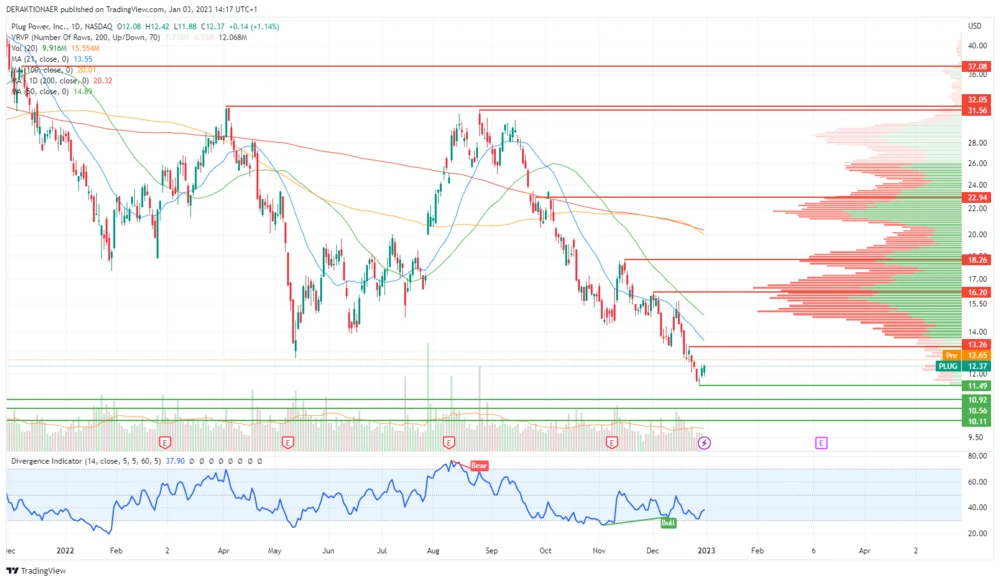 Für Tech-Titel wird es damit spannend, da Anleger besonders auf diese Veröffentlichungen schauen, weil Rückschlüsse auf die weiteren Schritte der Fed möglich sind. Für die Plug-Power-Aktie wird es damit Ernst, da der Kurs vor wenigen Tagen ein frisches Mehrjahrestief bei 11,49 Dollar erreicht. Es folgte eine erste technische Gegenbewegung, die sich auch am ersten Handelstag 2023 fortsetzen sollte, da die vorbörsliche Kursindikation eine freundliche Eröffnung von 2,1 Prozent andeutet.