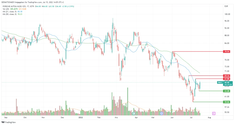 Die Lieferprobleme sind nicht neu und Anleger zeigen sich wenig geschockt von der Nachricht – im Gegenteil. Schnäppchenjäger schieben den DAX vor dem Wochenende an und auch die Porsche-Aktie (Vz.) notiert um rund 4,4 Prozent fester. Damit erholt sich der Titel weiter vom Jahrestief bei 59,06 Euro. Auch der kurzfristige GD21 bei rund 65 Euro haben die Bullen mit dem heutigen Anstieg überwunden. Nun wird bereits der Widerstand bei 67,88 Euro ins Visier genommen. Gelingt der Ausbruch, wird eine technische Trendumkehr vollzogen.