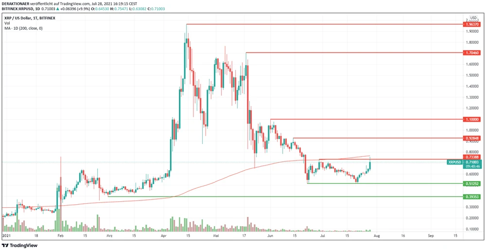 Das Sentiment am Krypto-Markt ist so positiv wie seit Wochen nicht mehr. XRP führt momentan die Erholungswelle bei den Top 5 Krypto-Währungen an. Der aktuelle Widerstand bei 0,73 Dollar stellt momentan nur einen Zwischenstopp dar. Gelingt auch der nachhaltige Ausbruch über den GD200 bei 0,76 Dollar, ist der Abwärtstrend Geschichte.