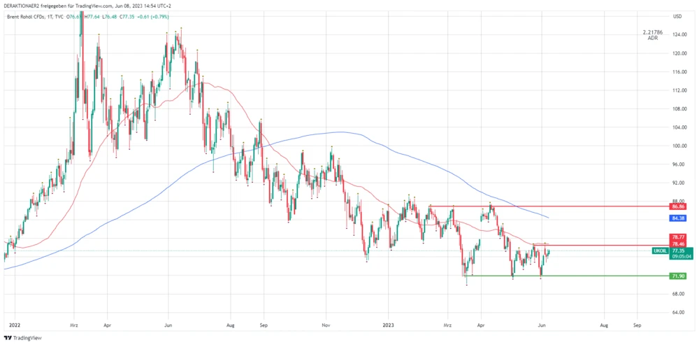 Brent handelt seit Wochen in einer Range und die Bullen und Bären liefern sich ein Kopf an Kopf rennen. Sorge um die Weltwirtschaft drücken auf die Stimmung. Frische Impulse entstehen, sobald der Kurs über den Widerstand bei 78,50 Dollar ausbricht (Kaufsignal) oder unter den Support bei der 72-Dollar-Marke fällt (Verkaufssignal).